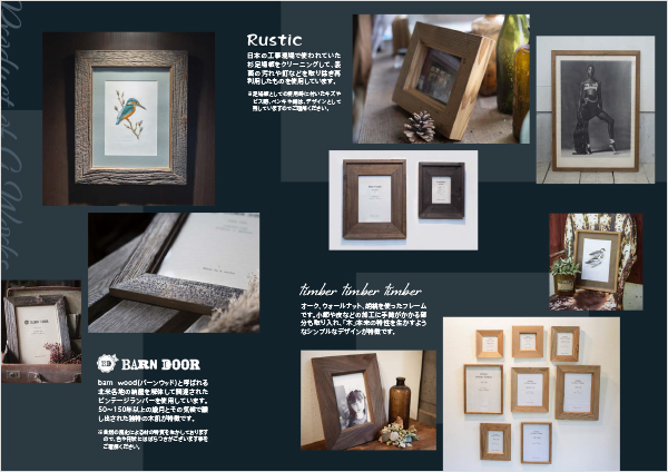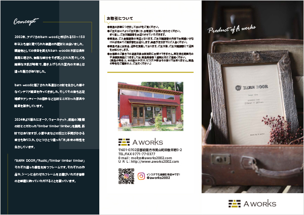 家具・雑貨メーカーの三つ折りリーフレット concept バーンウッドという廃材などを利用して家具や雑貨などを京都の美山地方で作られているAworks様のA4三つ折りリーフレットです。落ち着いた雰囲気が出るように深い色合いをベースに、単調になりすぎないレイアウトで構成されています。お家の中に1つあるだけで、お部屋の印象がグッと良くなりますよ! 表面 中面