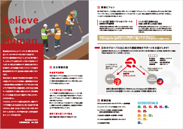 人材派遣サービスの会社案内パンフレット concept 建設現場への人材を派遣するサービスや、土木工事の施工及び請負を行っているエンワークス様の会社案内パンフレットです。特徴のあるロゴデザインをモチーフにインパクトのある表紙デザインを採用しています。二つ折りパンフレットなので、中面には会社の事業内容や持病ビジョンなどを掲載し、裏表紙に会社情報をまとめて掲載した形となっています。 表紙・裏表紙 中面