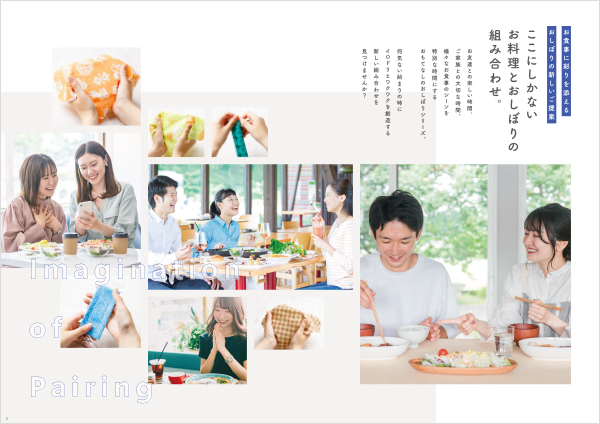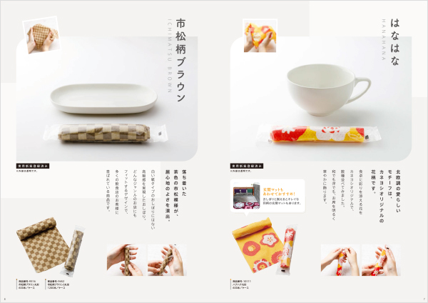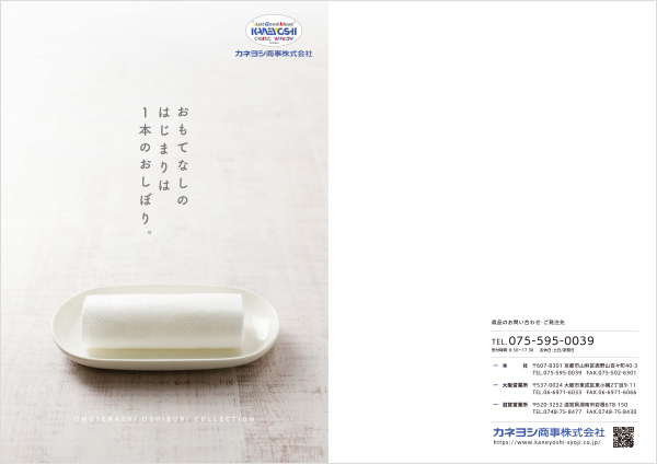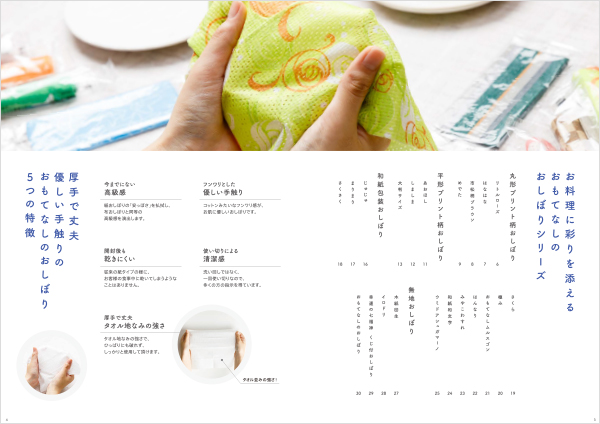 使い捨て紙おしぼりの商品カタログ concept 京都の山科でおしぼりの製造・販売を行っているカネヨシ商事様の使い捨て紙おしぼりの商品カタログです。飲食店やホテル・宿泊施設・介護施設などでお料理を作られている方が手に取って、自分のお店や施設の料理に合うおしぼりを見つけていただけるよう、あえて無地の白いお皿の前に色とりどりのおしぼりを置いてレイアウトしたカタログデザインです。 表紙・裏表紙 中面 中面 中面