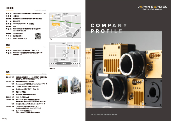 産業用カメラメーカーの会社案内パンフレット concept 産業用カメラメーカーであるジャパンボーピクセル株式会社のA3二つ折りパンフレットです。スペースが限られているので、中面には事業内容や強みを、裏表紙には会社の情報をまとめて掲載しています。 表紙・裏表紙 中面
